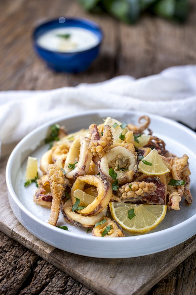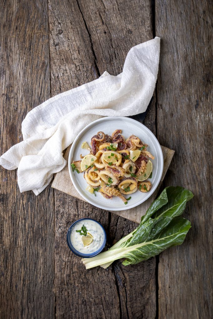 Klasične frigane lignje od svježih jadranskih lignji, poslužene uz domaći tartar od blitve.
